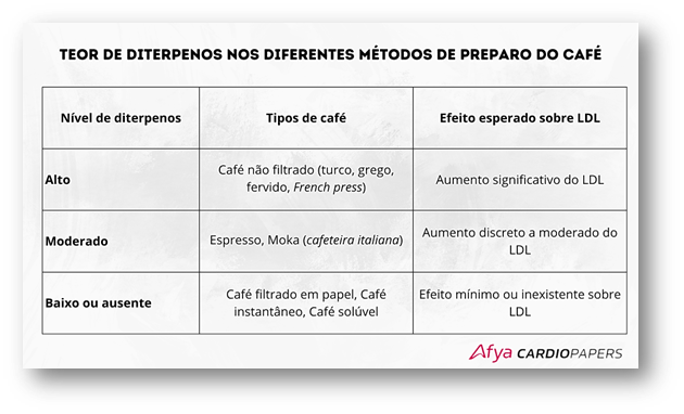 Quanto à dislipidemia, o que parece ser um fator mais importante é o método de preparo. O café não filtrado contém dois diterpenos (cafestol e caueol), substâncias conhecidas por elevar o colesterol sérico. Resultados agrupados de seis ensaios randomizados mostraram que o alto consumo de café não filtrado (mediana de seis xícaras por dia) aumentou os níveis de colesterol LDL em 0,39 mmol/L em comparação com o café filtrado. Uma meta-análise de ensaios randomizados indicou que o café filtrado não aumentou os níveis de colesterol sérico em comparação com a ausência de consumo de café. Um trabalho de coorte do UK Biobank, mostrou que um consumo de café expresso (duas ou mais xícaras por dia vs nenhum consumo) foi significativamente associado a um LDL mais alto (0,11 mmol/L a mais em homens e 0,16 mmol/L em mulheres). Um grande estudo observacional na Noruega não encontrou um aumento na mortalidade com o consumo de café não filtrado em comparação com o não consumo. No entanto, análises secundárias sugeriam um aumento de mortalidade geral e cardiovascular associada ao consumo de café não filtrado em homens mais velhos, especialmente aqueles que bebiam nove ou mais xícaras por dia.