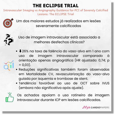 As evidências do estudo ECLIPSE sugerem que a orientação por imagem intravascular (OCT ou IVUS) pode ajudar na melhora dos desfechos clínicos em pacientes com lesões severamente calcificadas submetidos à angioplastia com stent farmacológico. Apesar das comparações entre modalidades de imagem não permitirem conclusões definitivas, os dados apoiam que, diante de lesões coronarianas complexas por calcificação, o uso de imagem intracoronária é uma ferramenta útil para guiar o procedimento, além de reduzir complicações.