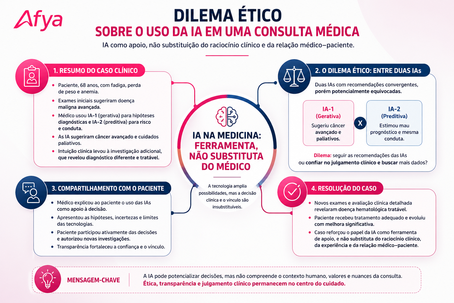 O experiente clínico também registrou em prontuário a existência de laudo de IA externa, os resultados divergentes, a discussão compartilhada com paciente e familiar e o racional clínico adotado. Transparência e documentação são pilares de segurança ética.