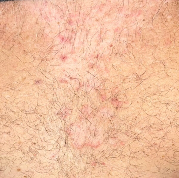 Paciente de 72 anos com histórico de melanoma estágio IV, em tratamento com Pembrolizumabe, refere surgimento de manchas brancas no colo tratadas com tacrolimo tópico por 3 meses, evoluindo com piora das lesões. Ao exame, manchas hipocrômicas, algumas com bordas eritematosas descamativas e circinadas, além de pápulas eritematosas (Figura).