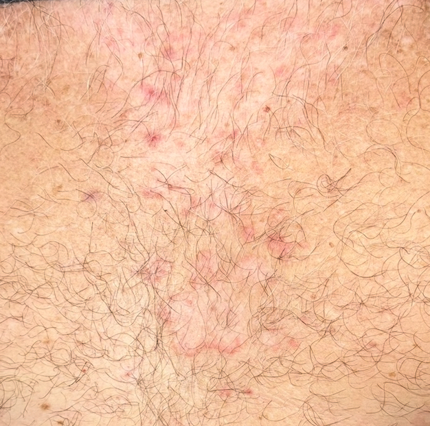 Foi realizada biópsia da borda das lesões, o que evidenciou hifas na camada córnea, melhor visualizadas pela coloração PAS. Somado à clínica, foi diagnosticado tinea corporis, infecção cutânea superficial que acomete a pele glabra, causada por fungos dermatófitos.