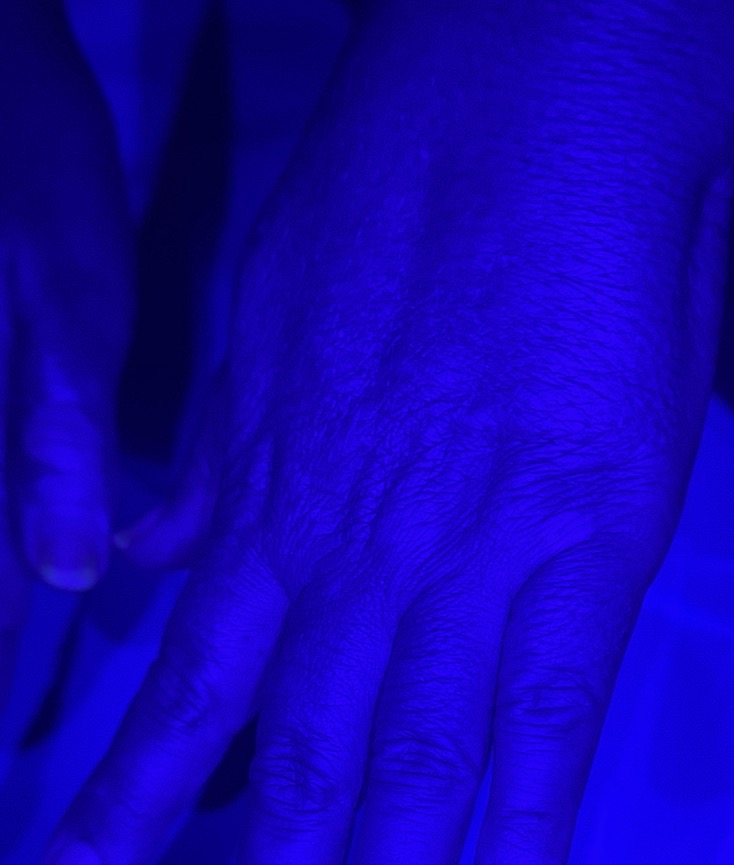 Ao exame, manchas hipocrômicas no dorso do 1º quirodáctilo direito e dorso da mão próximo ao 5º quirodáctilo esquerdo (Figura 1) e que são destacadas em coloração branco-azulada pelo exame com a luz de Wood (Figura 2).