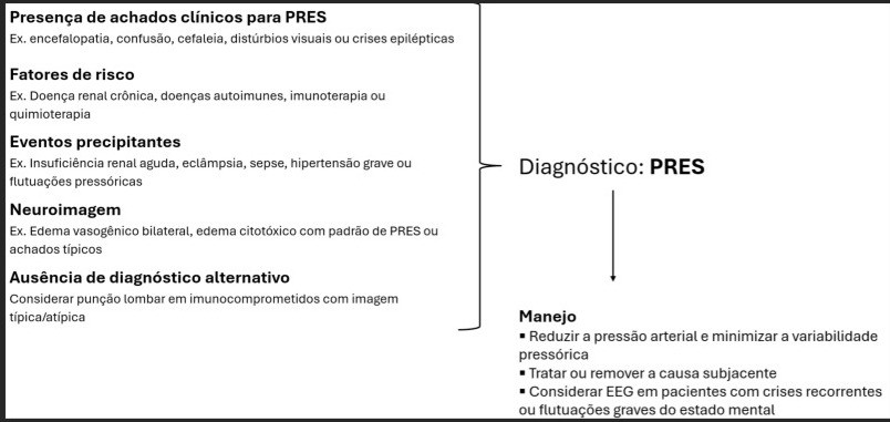 O diagnóstico de PRES exige julgamento clínico, levando em consideração os sintomas e sinais apresentados, os fatores de risco e os achados de neuroimagem. Considerando a ausência de critérios diagnósticos universalmente aceitos, os autores elaboraram um algoritmo atualizado, baseado em experiência clínica, para auxiliar no diagnóstico dessa condição, conforme presente no Fluxograma 1.
