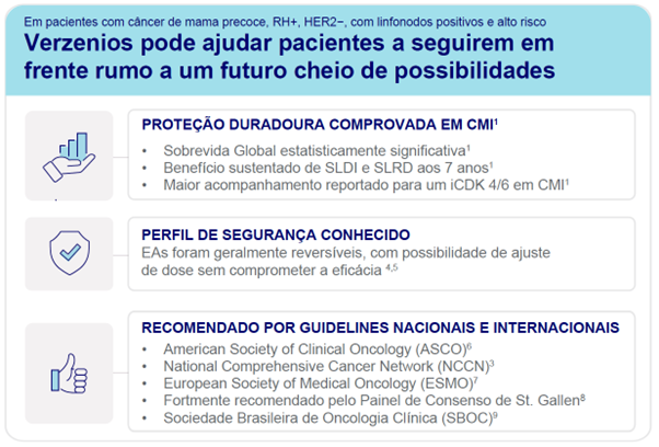 4. Bula Verzenios®: Abemaciclibe, São Paulo: Eli Lilly do Brasil Ltda., 2023. Bula do medicamento. Disponível em: <https://consultas.anvisa.gov.br/#/bulario/q/?numeroRegistro=112600199>. Acesso em: Outubro/2025;