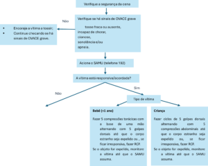 - Se não responder (estiver desacordada): iniciar manobras de Reanimação Cardiopulmonar (RCP) começando pelas compressões torácicas. Antes da ventilação, checar se visualiza corpo estranho na boca da vítima. Se conseguir ver e alcançar , usar manobra de pinça com polegar e indicador para retirá-lo. Se não ver ou não alcançar o corpo estranho, continue RCP.