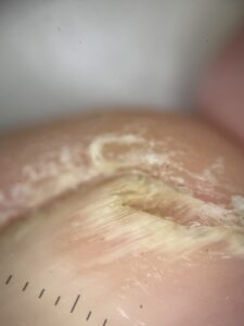 Paciente de 71 anos se queixa de lesão na unha do 1º pododáctilo direito há 1 ano e sem melhora com uso de cetoconazol creme. Ao exame, onicólise lateral da unha e, na dermatoscopia, foi possível observar onicólise com borda proximal “espiculada”, além de hiperceratose subungueal (Figura 1). Foi solicitado raspado da unha para exame micológico direto e cultura para fungos, ambos com resultado negativo.