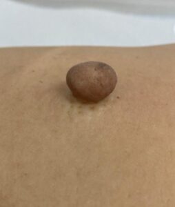 Paciente feminina, 56 anos, apresenta lesão papulosa, assintomática e pedunculada, representada na imagem a seguir. O exame histopatológico confirmou o diagnóstico de pólipo fibroepitelial.
