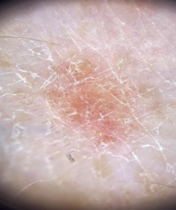Paciente masculino, 49 anos, portador de psoríase vulgar, apresenta numerosas placas eritematodescamativas em superfícies extensoras. A dermatoscopia da placa está representada na imagem a seguir: