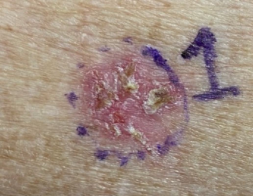 Paciente feminina, 87 anos, apresenta placa eritematodescamativa no antebraço direito, mostrada na imagem. O exame histopatológico confirmou doença de Bowen.