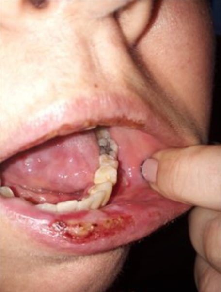 Paciente de 50 anos, hígida, apresenta ulceração no lábio e na mucosa jugal (figura 1), com dor e disfagia importante. Relata evolução há um ano e intermitente.