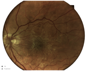 Retinografia colorida do olho esquerdo: observa-se a presença de membrana epirretiniana na região macular, com brilho reflexivo superficial e pregueamento das camadas internas da retina, determinando distorsão do reflexo foveal compatível com pucker macular. Vasos retinianos apresentam leve tortuosidade na área acometida.