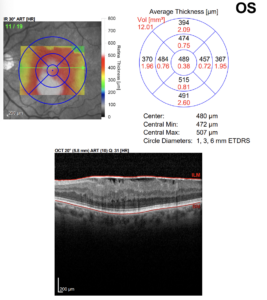 Tomografia de coerência óptica (OCT) macular – olho esquerdo: espessamento retiniano difuso com elevação e irregularidade da superfície interna (ILM), associado a tração e pregueamento das camadas internas, compatíveis com membrana epirretiniana. Observa-se padrão de desorganização das camadas internas da retina (DRIL) e perda da depressão foveal normal, com espessura central de 480 µm. Esses achados corroboram o diagnóstico clínico de pucker macular secundário à membrana epirretiniana.