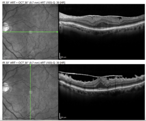Paciente masculino, 78 anos, procura o consultório oftalmológico com queixa de baixa acuidade visual progressiva e metamorfopsia em olho direito há alguns meses. No exame de fundo de olho e tomografia de coerência óptica (OCT), foi detectada membrana epirretiniana com distorção macular (pucker).