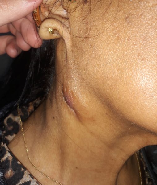 Região cervical anterior direita com presença de nodulação de consistência fibroelástica, móvel e indolor. Não aderida aos planos profundos e sem flogose. Outras cadeias linfonodais cervicais sem alterações, assim como axilares e inguinais.