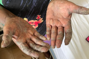 Paciente, 53 anos, sexo feminino, procura atendimento médico devido ao quadro de dispneia progressiva e fraqueza muscular proximal. Foi observada a seguinte alteração ao exame físico.