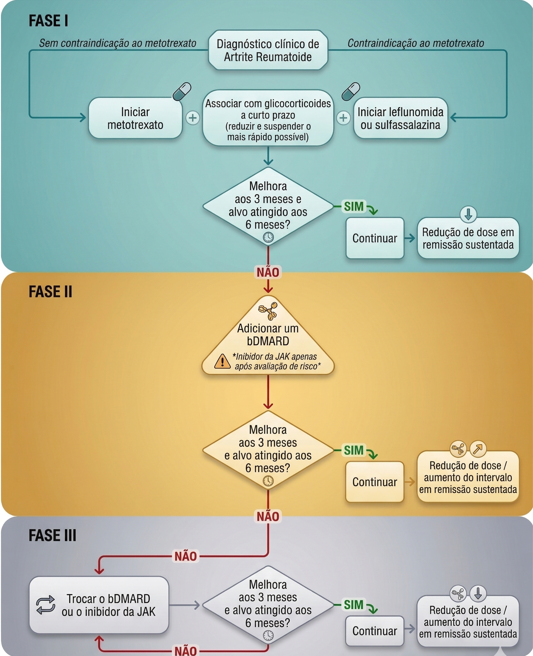 Se o alvo do tratamento não for alcançado com a estratégia de MMCD sintético convencional, um MMCD biológico deve ser adicionado; os inibidores da JAK podem ser considerados, mas fatores de risco pertinentes, especialmente relacionado ao risco trombótico e neoplásico, devem ser ser considerados. Via de regra, MMCDs biológicos e alvo específicos devem ser combinados com um MMCD sintético convencional. Nos pacientes que o MMCD sintético convencional não pode ser utilizado como comedicação, inibidores da via IL-6 e inibidores da JAK podem ter algumas vantagens em comparação com outros bDMARDs, por poderem ser utilizados em monoterapia.